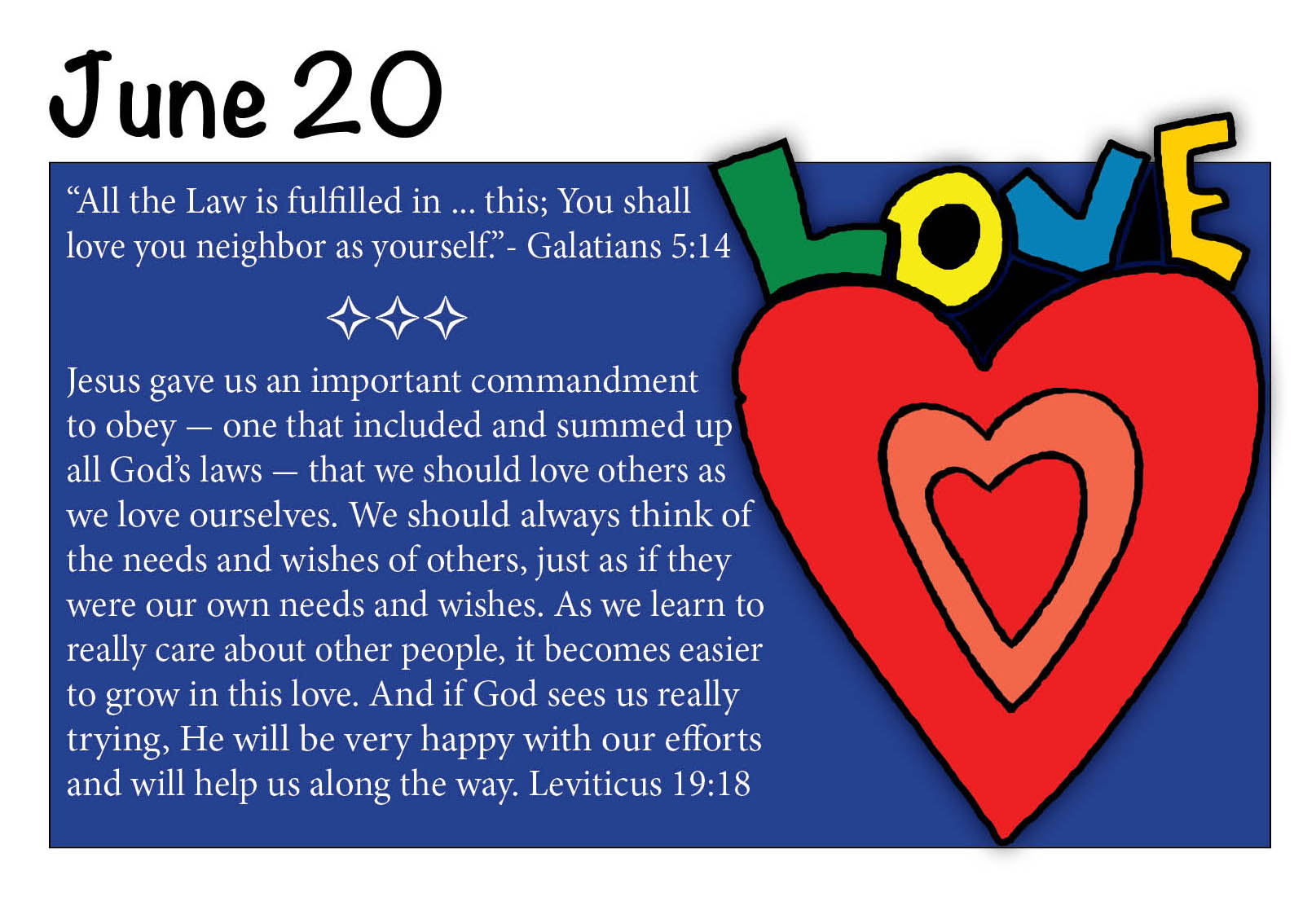 Jesus gave us a new commandment to obey - one which included all God's laws - that we should love others as we love ourselves. We should always think of the needs and wishes of others, just as if they were our own needs and wishes. As we learn to really care about other people, it becomes easier to grow in this love. And God will help us, and be very pleased with our efforts. Leviticus 19:18