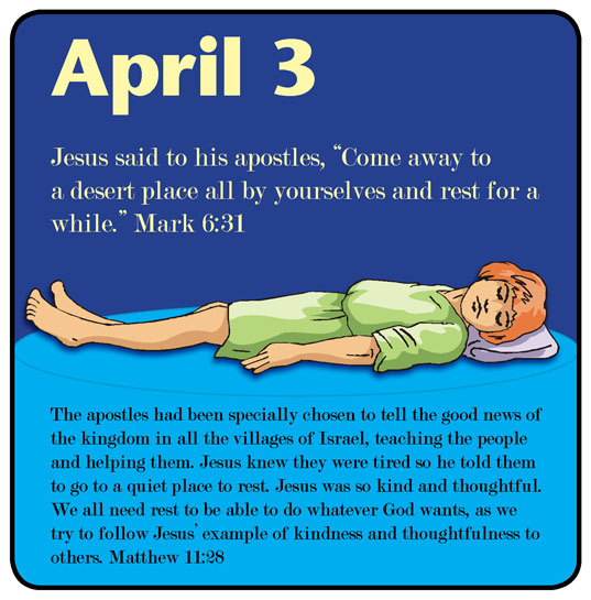 The apostles had been specially chosen to tell the good news of the kingdom in all the villages of Israel, teaching the people and helping them. Jesus knew they were tired, so he told them to go to a quiet place to rest. How kind and thoughtful Jesus was! We all need rest in order that we will be able to do whatever God wants, as we try to follow Jesus' example of kindness and thoughtfulness to others. Matthew 11:28